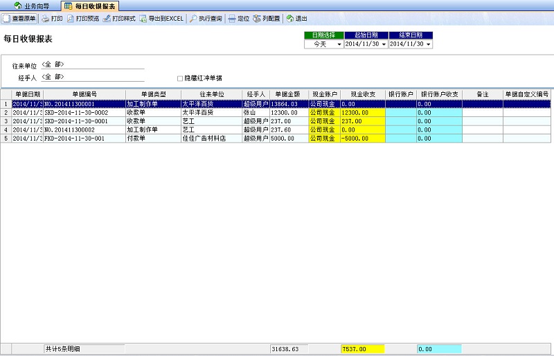 (2)每天的結(jié)算,就直接使用噴繪記賬軟件的“每日收銀報(bào)表”就可以把收入和支出進(jìn)行統(tǒng)計(jì),包括單據(jù)類型、往來(lái)單位、經(jīng)手人、單據(jù)金額、現(xiàn)金收支等具體的信息。每日收銀報(bào)表也是可以進(jìn)行打印和導(dǎo)出為Excel表格。