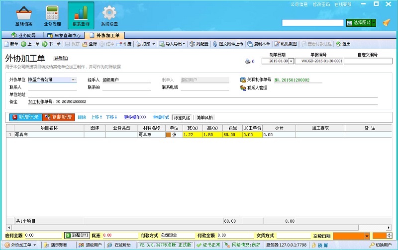 美高廣告有限責(zé)任公司是重慶璧山區(qū)是一家設(shè)計策劃型廣告公司,很多項目接下來以后,都要交給廣告制作公司進行加工,因為每次外協(xié)加工制作的單都是要交給多家外協(xié)單位進行加工,因此就需要在開單的時候,就能夠關(guān)聯(lián)到多家外協(xié)單位進行加工制作。我們的客服就遠程幫助小劉進行外協(xié)加工管理演示,在飛揚動力廣告公司管理系統(tǒng)中,用戶可以在開加工制作單的時候,把客戶需要制作的項目分攤給不同的外協(xié)單位進行制作。首先在加工制作單中的報價,就是給客戶的報價,而轉(zhuǎn)交給外協(xié)單位進行加工制作的報價就是外協(xié)單位的加工制作報價,因此廣告公司就是賺取其中的差價來獲取利潤。