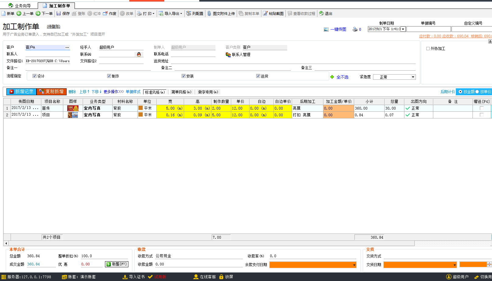 1.快速開單為廣告公司的業(yè)務(wù)員提供了快速開單的功能,拖動圖片到軟件,軟件可以自動識別圖片中的信息,包含項目名稱(制作內(nèi)容)、材料名稱、寬、高、制作數(shù)量以及后期加工等信息,材料單價此前已經(jīng)綁定,自動顯示,所以整張單據(jù)都不需要再手動去填寫相關(guān)的業(yè)務(wù)信息,廣告公司管理軟件就已經(jīng)自動開好單據(jù)。保存登賬計入財務(wù)。