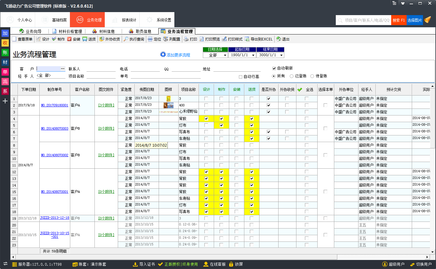飛揚(yáng)動(dòng)力廣告公司管理軟件業(yè)務(wù)流程管理,可以添加和管理最多20個(gè)流程節(jié)點(diǎn),快速有效的管理廣告公司業(yè)務(wù)流程。并快速有效的管理員工業(yè)績: