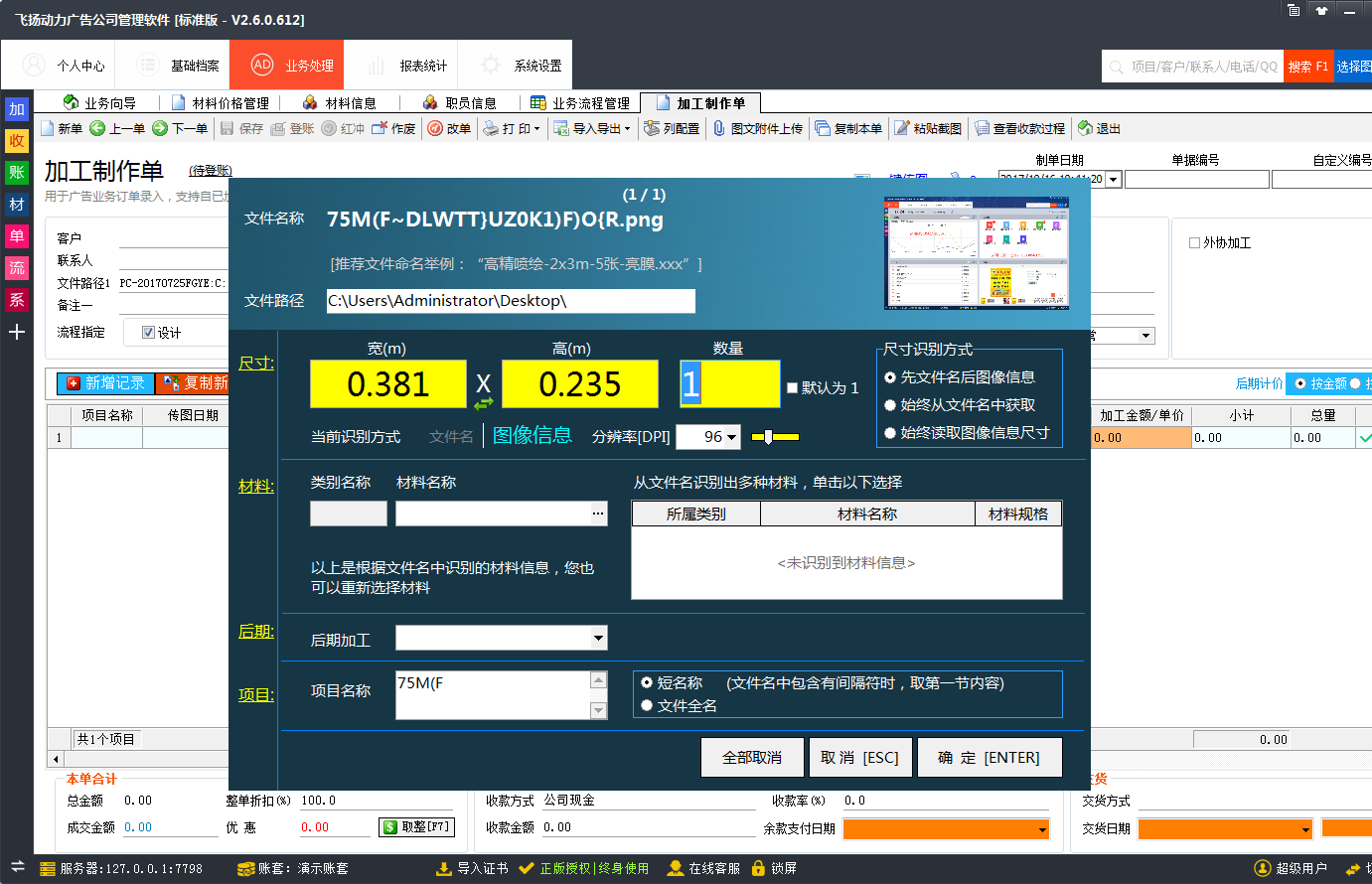 在飛揚動力噴繪管理軟件中,只需要把圖片直接拖入軟件,軟件就會自動識別圖片的尺寸大小,圖片名稱的命名方式最好是按照我們軟件的要求:“畫面內容-寬-高-材料-數(shù)量-白邊-后期加工”: