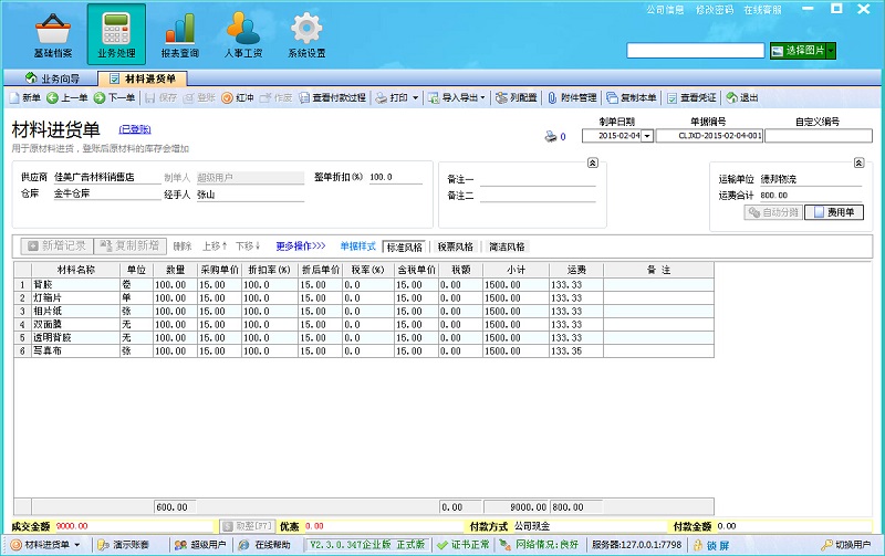 在廣告公司管理系統(tǒng)中,需要用戶對自己公司的倉庫的庫存量進行入庫出庫管理,入庫的主要方式當然就是通過材料進貨入庫,用戶需要開出材料進貨單,記錄本次采購的材料是哪一些,采購單價、采購數(shù)量等信息,以及能夠把本次運費等費用算到成本中去,平攤到每一個產(chǎn)品的采購單價中。如下圖所示: