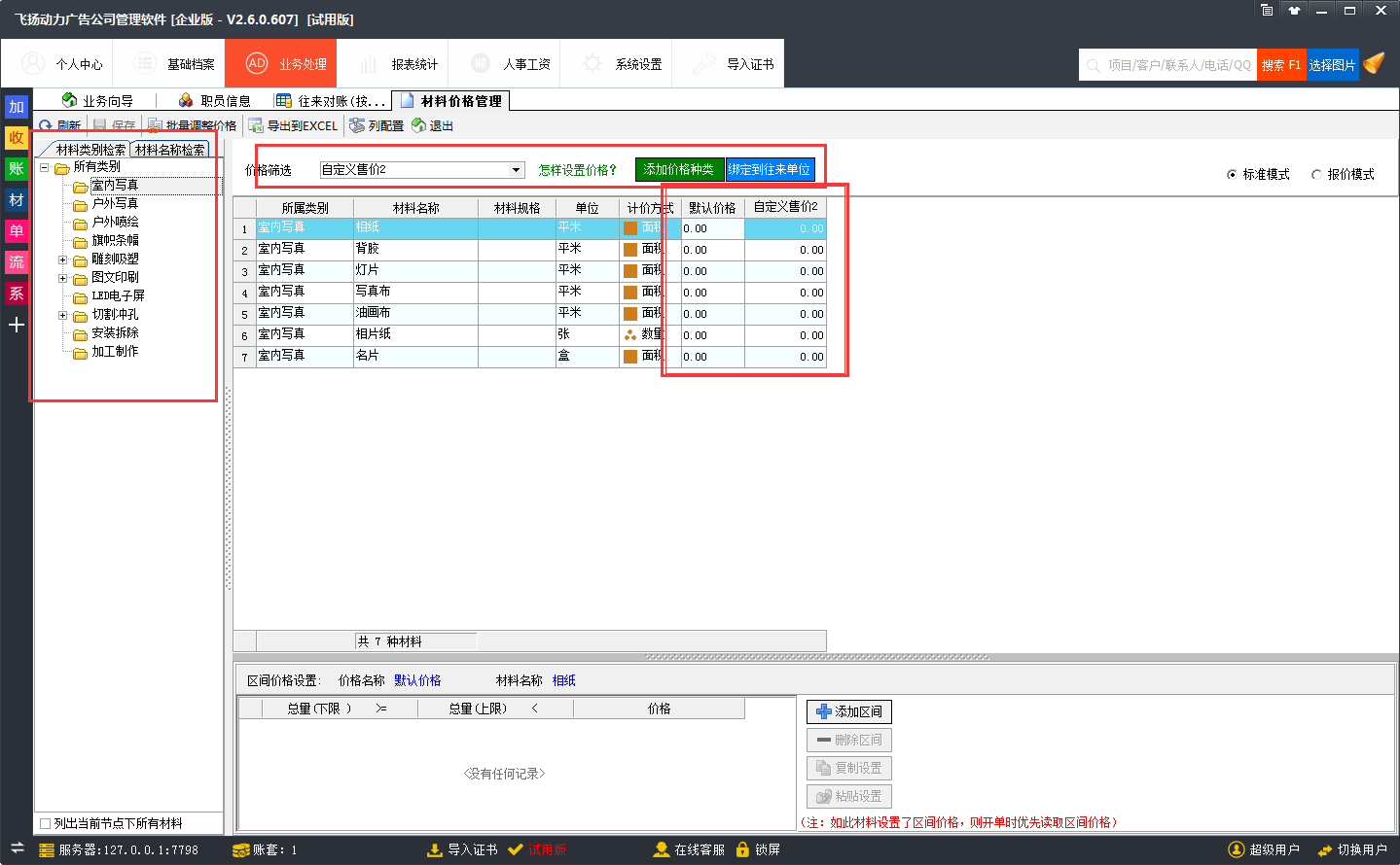 客戶(hù)價(jià)格綁定:飛揚(yáng)動(dòng)力廣告公司管理軟件可以針對(duì)不同的客戶(hù)設(shè)置不同的價(jià)格,比如,針對(duì)臨時(shí)客戶(hù)設(shè)置一套獨(dú)立的價(jià)格,只需要到材料價(jià)格管理中,添加一個(gè)臨時(shí)客戶(hù)的分類(lèi)。然后,填寫(xiě)對(duì)應(yīng)的臨時(shí)客戶(hù)的材料價(jià)格就可以了。