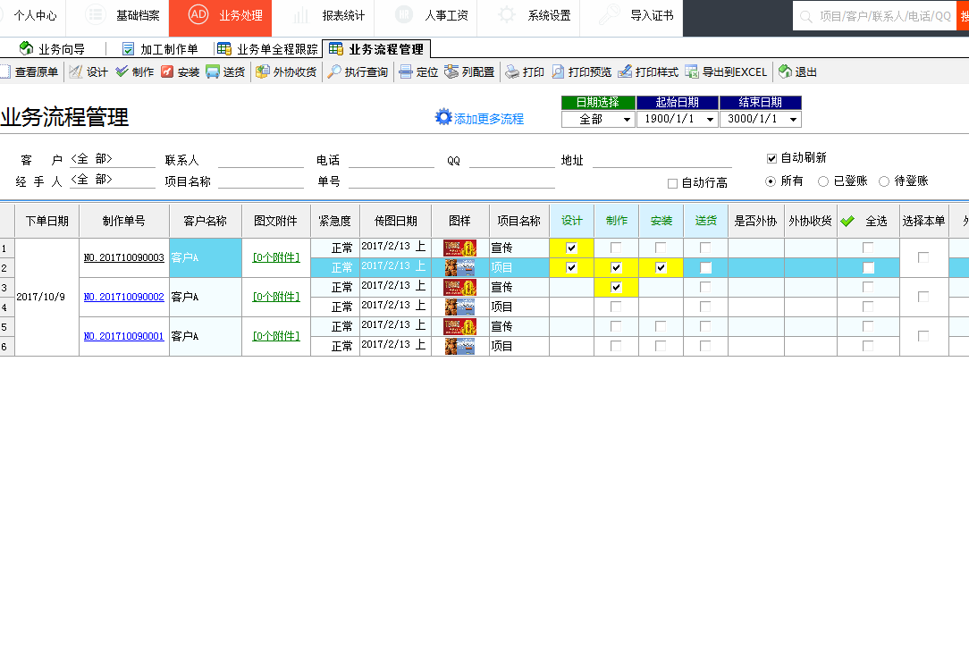 飛揚動力廣告公司管理軟件中針對廣告公司實際整個業(yè)務(wù)的公司內(nèi)部流程做了規(guī)范的管理方案。業(yè)務(wù)單需要的流程,流程是否完成等狀態(tài)可以非常直觀的體現(xiàn)出來,需要查詢業(yè)務(wù)單進(jìn)度各員工也可以直接查詢,大大優(yōu)化了各部門之間的銜接過程,這樣不僅提高了公司效率,更是使得公司管理更加科學(xué)化規(guī)范化。